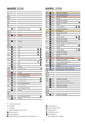AVRIL 2026ME 1 19:30 Rom%u00e9o et Juliette ME 1 20:00 La Finta giardinieraJ 2 19:30 Rom%u00e9o et Juliette V 3 19:30 ToscaS 4 19:30 Rom%u00e9o et Juliette D 5 14:30 Rom%u00e9o et Juliette L 6 14:30 ToscaMA 7 14:00 YANA%u2009/%u2009SVEN MA 7 19:30 Rom%u00e9o et Juliette MA 7 19:30 Satyagraha ME 8 19:30 Rom%u00e9o et Juliette J 9 19:30 ToscaV 10 14:00 YANA%u2009/%u2009SVEN V 10 19:30 Rom%u00e9o et JulietteS 11 19:30 Rom%u00e9o et Juliette%u20091S 11 10:30 Atelier SVEN, mes parents et moiS 11 20:00 YANA%u2009/%u2009SVEND 12 14:30 ToscaD 12 15:00 YANA%u2009/%u2009SVEN L 13 19:30 Rom%u00e9o et Juliette MA 14 19:30 Rom%u00e9o et Juliette ME 15 19:30 ToscaME 15 19:30 Spectacle de l%u2019%u00c9cole de Danse J 16 19:30 Rom%u00e9o et Juliette V 17 11:15 Cours publics de danseV 17 19:30 Rom%u00e9o et Juliette S 18 19:30 ToscaS 18 19:30 Spectacle de l%u2019%u00c9cole de DanseD 19 14:30 Spectacle de l%u2019%u00c9cole de Danse L 20MA 21ME 22J 23V 24 19:30 Rom%u00e9o et Juliette S 25 11:15 Cours publics de danseS 25 15:00 R%u00e9p%u00e9tition Rom%u00e9o et JulietteS 25 19:30 Rom%u00e9o et Juliette D 26 14:30 Rom%u00e9o et Juliette L 27MA 28ME 29J 30 19:30 Rom%u00e9o et Juliette MARS 2026D 1L 2MA 3ME 4J 5V 6S 7D 8L 9 14:00 Quintette pour fl%u00fbte, harpe%u00a0et%u00a0trio%u00a0%u00e0 cordesMA 10ME 11J 12 19:30 ToscaV 13S 14D 15 14:30 ToscaL 16MA 17ME 18 19:30 ToscaJ 19 10:00 9.2 J 19 14:00 9.2 V 20 14:00 9.2 V 20 20:00 9.2 S 21 10:30 Atelier 9.2, mes parents et moiS 21 15:00 9.2 S 21 20:00 9.2 S 21 19:30 ToscaD 22 12:00 Midi musicalL 23MA 24 19:30 ToscaMA 24 20:00 La Finta giardinieraME 25 20:00 La Finta giardinieraJ 26 14:00 Florence PriceV 27 14:00 Florence PriceV 27 20:00 La Finta giardinieraS 28 15:00 Florence PriceS 28 18:00 La Finta giardinieraS 28 19:30 ToscaD 29L 30MA 31 14:30 La Finta giardinieraMA 31 19:30 ToscaNOUVEAU SPECTACLEPREMI%u00c8REDERNI%u00c8REAVANT-PREMI%u00c8RE JEUNES -%u200928 ANSOP%u00c9RA BASTILLEPALAIS GARNIERAMPHITH%u00c9%u00c2TRE OLIVIER MESSIAEN %u2013 OP%u00c9RA BASTILLESTUDIO BASTILLEHORS LES MURS : MC93S%u00c9ANCE RELAXMATIN%u00c9E SCOLAIREGILET SUBPAC 1. %u2009MA PREMI%u00c8RE FOIS %u00c0 L%u2019OP%u00c9RA41