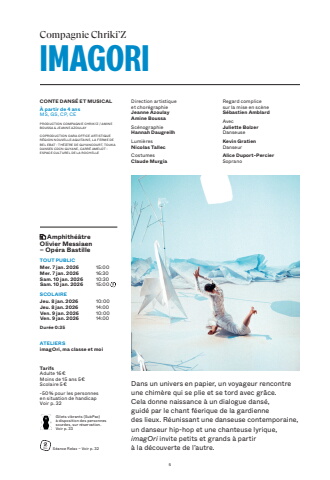 Amphith%u00e9%u00e2tre Olivier%u00a0Messiaen%u2013%u00a0Op%u00e9ra BastilleTOUT PUBLICMer. 7 jan. 2026 15:00Mer. 7 jan. 2026 16:30Sam. 10 jan. 2026 10:30Sam. 10 jan. 2026 15:00SCOLAIREJeu. 8 jan. 2026 10:00Jeu. 8 jan. 2026 14:00Ven. 9 jan. 2026 10:00Ven. 9 jan. 2026 14:00Dur%u00e9e 0:35ATELIERSimagOri, ma classe et moiTarifsAdulte 16%u2009%u20acMoins de 15 ans 5%u2009%u20acScolaire 5%u2009%u20ac-50%u2009% pour les personnes en%u00a0situation de handicapVoir p. 32Gilets vibrants (SubPac) %u00e0%u00a0disposition des personnes sourdes, sur r%u00e9servation. Voir p. 33S%u00e9ance Relax %u2013 Voir p. 32Dans un univers en papier, un voyageur rencontre une chim%u00e8re qui se plie et se tord avec gr%u00e2ce. Cela%u00a0donne naissance %u00e0 un dialogue dans%u00e9, guid%u00e9%u00a0par le chant f%u00e9erique de la gardienne des%u00a0lieux. R%u00e9unissant une danseuse contemporaine, un%u00a0danseur hip-hop et une chanteuse lyrique, imagOri invite petits et grands %u00e0 partir %u00e0%u00a0la%u00a0d%u00e9couverte de%u00a0l%u2019autre.Compagnie Chriki%u2019ZIMAGORICONTE DANS%u00c9 ET MUSICAL%u00c0 partir de 4 ansMS, GS, CP, CE PRODUCTION COMPAGNIE CHRIKI%u2019Z / AMINE BOUSSA & JEANNE AZOULAYCOPRODUCTION OARA OFFICE ARTISTIQUE R%u00c9GION NOUVELLE-AQUITAINE, LA FERME DE BEL EBAT - TH%u00c9%u00c2TRE DE GUYANCOURT, TOUKA DANSES CDCN GUYANE, CARR%u00c9 AMELOT - ESPACE CULTUREL DE LA ROCHELLEDirection artistique et%u00a0chor%u00e9graphieJeanne Azoulay Amine BoussaSc%u00e9nographieHannah DaugreilhLumi%u00e8resNicolas TallecCostumesClaude MurgiaRegard complice sur%u00a0la%u00a0mise%u00a0en%u00a0sc%u00e8neS%u00e9bastien AmblardAvecJuliette Bolzer DanseuseKevin Gratien DanseurAlice Duport-Percier Soprano5