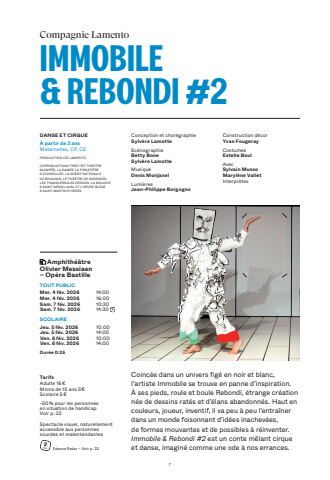 Compagnie LamentoIMMOBILE & REBONDI #2 Amphith%u00e9%u00e2tre Olivier%u00a0Messiaen%u2013%u00a0Op%u00e9ra BastilleTOUT PUBLICMer. 4 f%u00e9v. 2026 14:00Mer. 4 f%u00e9v. 2026 16:00Sam. 7 f%u00e9v. 2026 10:30Sam. 7 f%u00e9v. 2026 14:30SCOLAIREJeu. 5 f%u00e9v. 2026 10:00Jeu. 5 f%u00e9v. 2026 14:00Ven. 6 f%u00e9v. 2026 10:00Ven. 6 f%u00e9v. 2026 14:00Dur%u00e9e 0:35TarifsAdulte 16%u2009%u20acMoins de 15 ans 5%u2009%u20acScolaire 5%u2009%u20ac-50%u2009% pour les personnes en%u00a0situation de handicapVoir p. 32Spectacle visuel, naturellement accessible aux personnes sourdes et%u00a0malentendantesS%u00e9ance Relax %u2013 Voir p. 32Coinc%u00e9e dans un univers fig%u00e9 en noir et blanc, l%u2019artiste Immobile se trouve en panne d%u2019inspiration. %u00c0%u00a0ses pieds, roule et boule Rebondi, %u00e9trange cr%u00e9ation n%u00e9e de dessins rat%u00e9s et d%u2019%u00e9lans abandonn%u00e9s. Haut en couleurs, joueur, inventif, il%u00a0va%u00a0peu %u00e0 peu l%u2019entra%u00eener dans un monde foisonnant d%u2019id%u00e9es inachev%u00e9es, de%u00a0formes mouvantes et%u00a0de%u00a0possibles %u00e0 r%u00e9inventer. Immobile & Rebondi #2 est%u00a0un conte m%u00ealant cirque et%u00a0danse, imagin%u00e9 comme une ode %u00e0 nos errances.DANSE ET CIRQUE%u00c0 partir de 3 ansMaternelles, CP, CEPRODUCTION CIE LAMENTO COPRODUCTIONS TR%u00c8S T%u00d4T TH%u00c9%u00c2TRE QUIMPER, LA RAMPE-LA PONATI%u00c8RE %u00c0%u00a0ECHIROLLES, LA SC%u00c8NE NATIONALE DE%u00a0BEAUVAIS, LE TH%u00c9%u00c2TRE DE SURESNES, LES%u00a0TRANSVERSALES VERDUN, LA MOUCHE %u00c0%u00a0SAINT%u00a0GENIS LAVAL ET L%u2019HEURE BLEUE %u00c0%u00a0SAINT%u00a0MARTIN D%u2019H%u00c8RESConception et chor%u00e9graphieSylv%u00e8re LamotteSc%u00e9nographieBetty Bone Sylv%u00e8re LamotteMusiqueDenis MonjanelLumi%u00e8resJean-Philippe BorgognoConstruction d%u00e9corYvan FougerayCostumesEstelle BoulAvecSylvain MussoMaryl%u00e8ne%u00a0ValletInterpr%u00e8tes7