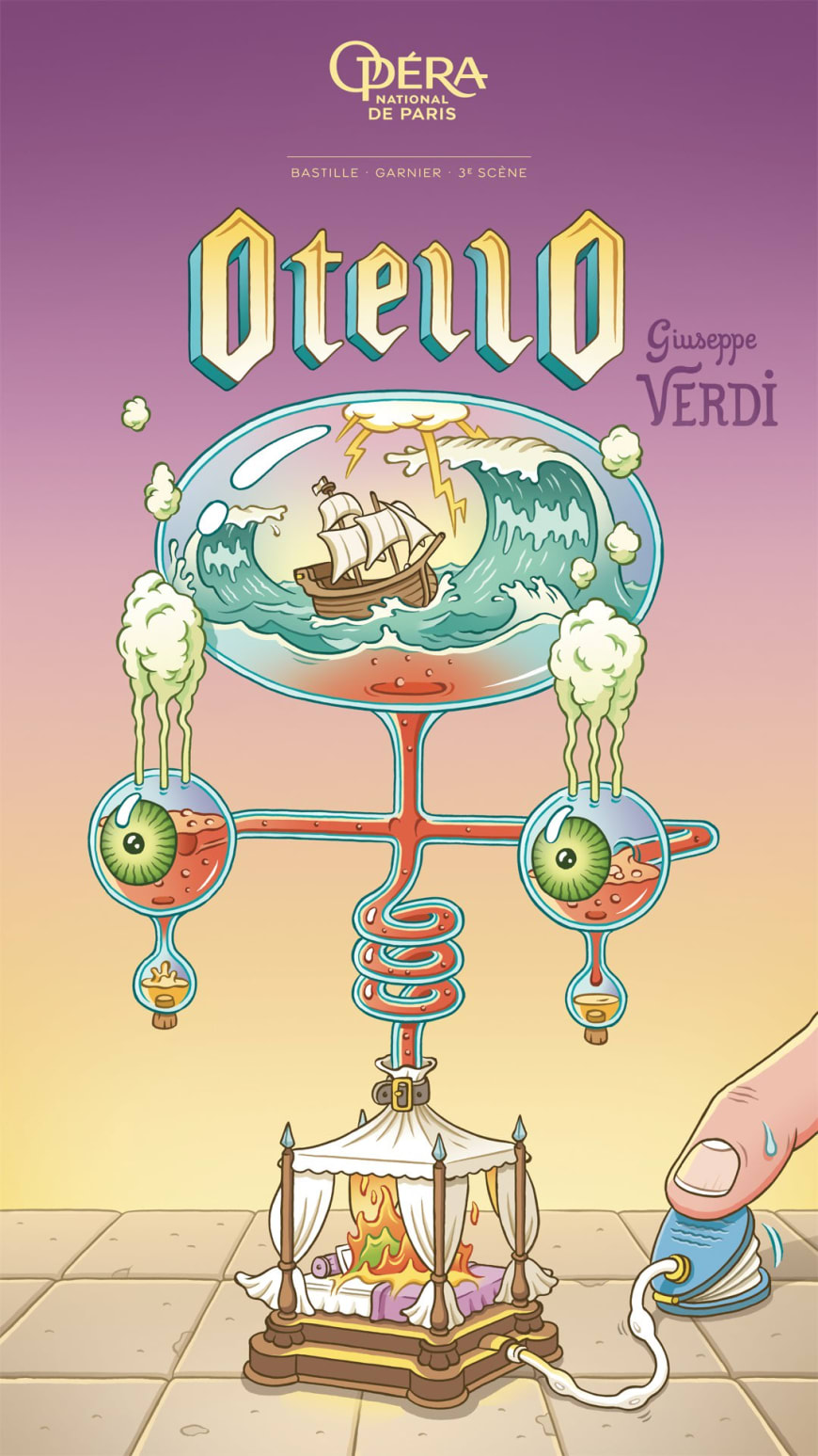 To mark its anniversary season, the Paris Opera is inviting illustrators to reinvent the posters for its productions and to propose their personal interpretation of a work. Jules Le Barazer has chosen Otello, composed by Giuseppe Verdi.