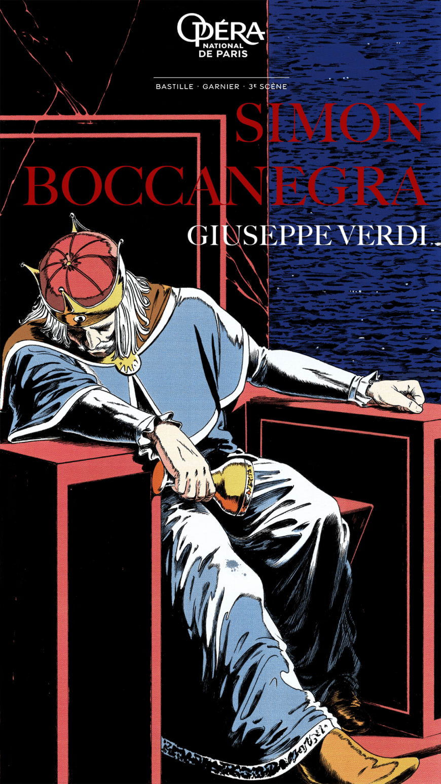 To mark its anniversary season, the Paris Opera is inviting illustrators to reinvent the posters for its productions and to propose their personal interpretation of a work. Kevin Manach explores Verdi's drama with Simon Boccanegra, currently running at the Opéra Bastille. He proposes a "retro" composition in which his classicism of line and that of the Doge's posture and attitude contrast with the palette of colours used and the representation of the horizonless sea coming to reclaim the poisoned corsair.