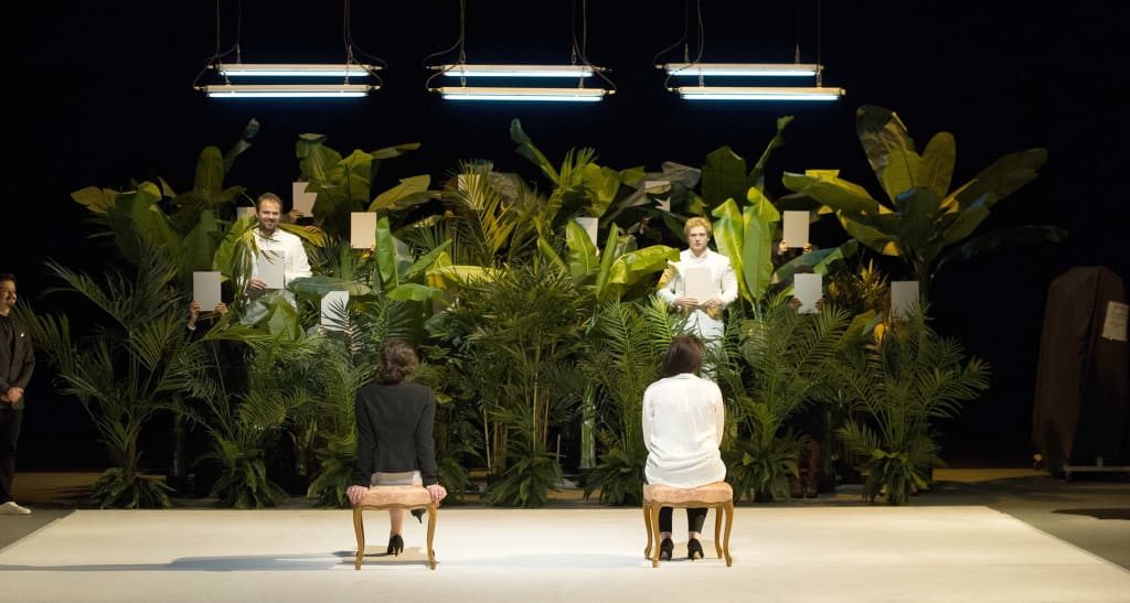 CosÌ fan tutte débute entre hommes, par une dispute de laquelle va naître un pari très risqué : « Et si je vous faisais, aujourd’hui, la démonstration que vos femmes, confrontées à la tentation du désir, ne pourront, comme toutes les autres, que céder ? ». Trois hommes et trois femmes sont en scène. Un vrai jeu de télé réalité ! Une île de la tentation ou une variante d’Adam et Eve en quelque sorte ! Mais revenons à nos couples, ils sont donc trois. L’un qui semble avoir déjà un lourd passif, et deux au début d’une relation qui se cherche encore.