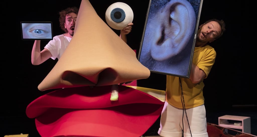NezQuiCoule est un opéra en cinq actes et cinq sens pour les tout‑petits, qui explore les différentes parties du visage et les fait dialoguer entre elles.